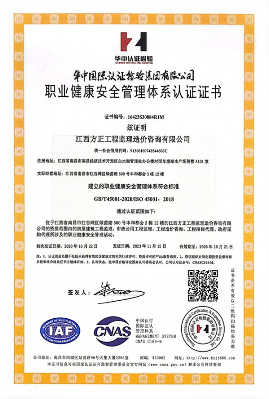 職業(yè)健康安全管理體系認證證書