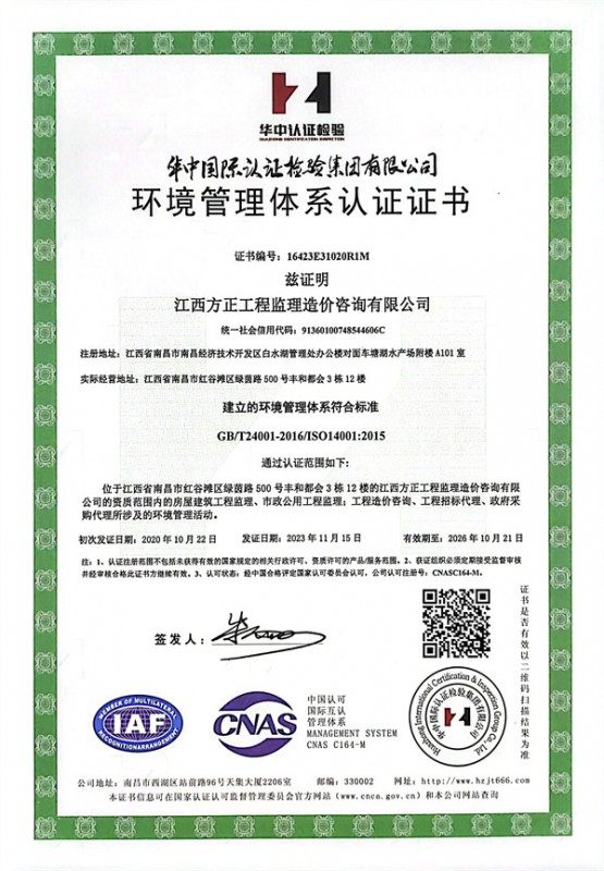 環(huán)境管理管理體系認證證書